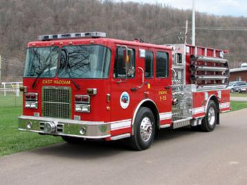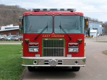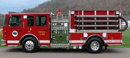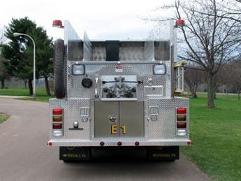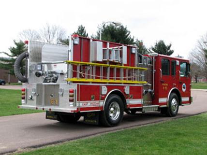 Features: (2) 1500 Watt Push Up Telescopic Lights, back of cab; Q2B Siren, recessed in bumper; (4) Suction hoses in aluminum “V” trays; Ladders Mounted Over Compartments; Custom “Little Giant” Mounting Bracket; Custom Water Thief Bracket, Whelen NFPA Lighting Package |